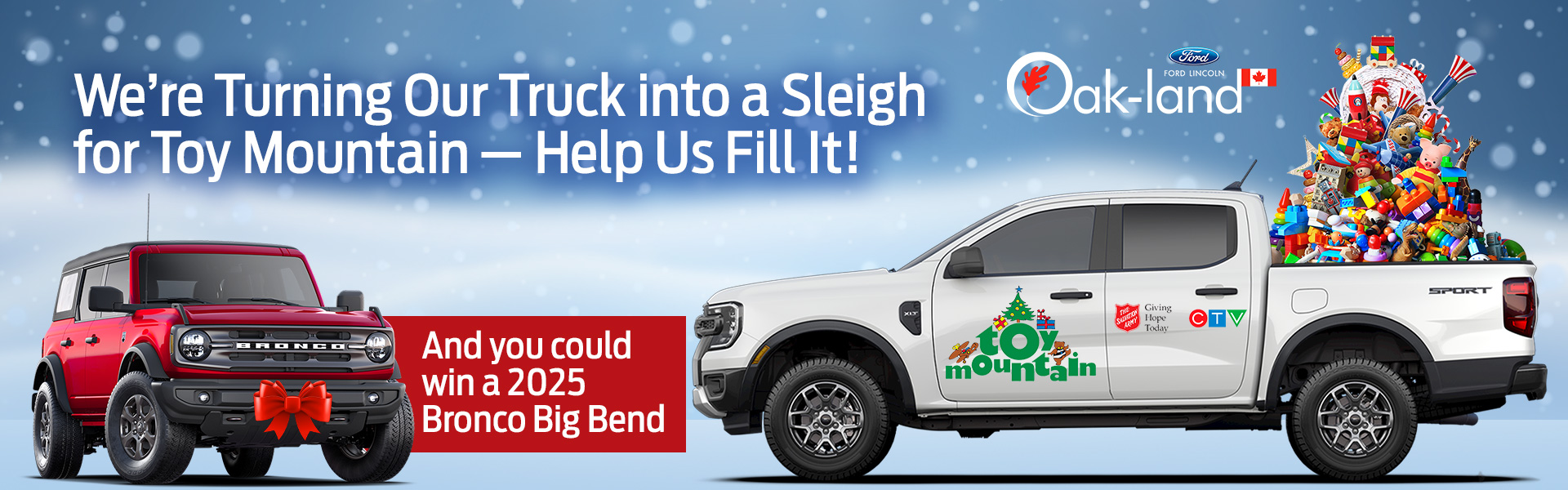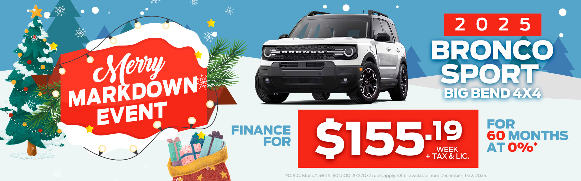 ** Retail offer valid at participating dealers from December 11 – 22, 2025. Dealer trade may be necessary (but may not be available in all cases). Receive purchase financing from 0% APR for up to 60 months on a new 2025 Ford Bronco Sport Badlands model on approved credit from Ford Credit Canada Company for qualified retail customers. Not everyone will qualify for this offer or the lowest interest rate. Dealers set selling price and may sell for less. Example: Finance $50,000 with $0 down payment at 0% APR for 60 months, monthly payment is $833 (total of 60 monthly payments); interest cost of borrowing is $0; and total to be repaid is $50,000 (except in Quebec where the total is $50,056 which includes $56 fee related to the RDPRM registration payable upon signature).