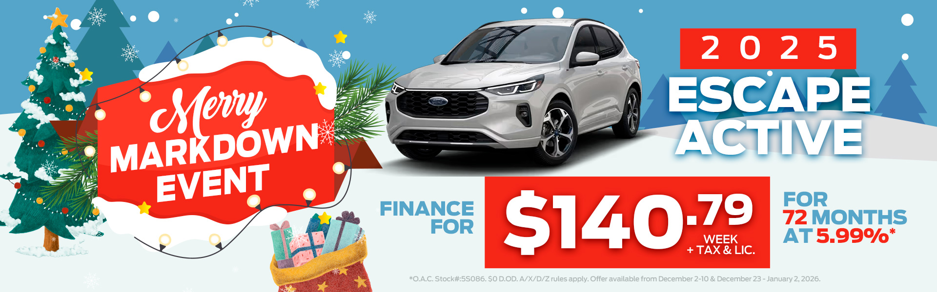 ** Retail offer valid at participating dealers from December 11 – 22, 2025. Dealer trade may be necessary (but may not be available in all cases). Receive purchase financing from 0% APR on new 2025 Ford Escape models with gas (excluding Quebec and British Columbia) or hybrid engines for up to 60 months on approved credit from Ford Credit Canada Company for qualified retail customers. Not everyone will qualify for this offer or the lowest interest rate. Dealers set selling price and may sell for less. Example: Finance $37,000 with $0 down payment at 0% APR for 60 months, monthly payment is $617 (total of 60 monthly payments); interest cost of borrowing is $0; and total to be repaid is $37,000 (except in Quebec where the total is $37,056 which includes $56 fee related to the RDPRM registration payable upon signature).